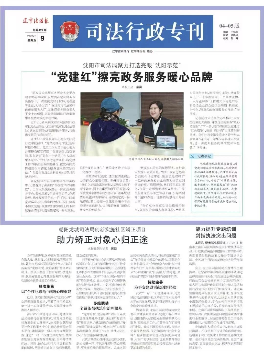 沈阳市司法局行政审批处(法制处)党支部党建赋能政务服务,打造出亮眼的“沈阳示范”。获《辽宁法治报》关注。
