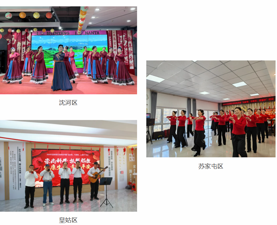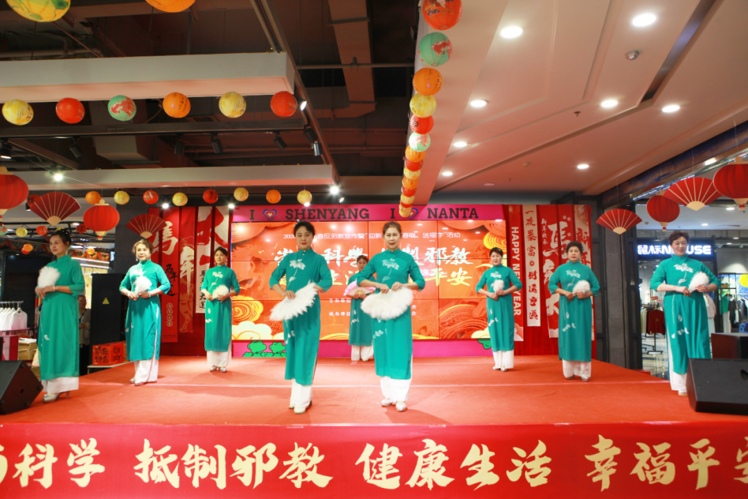 活动中,沈河区、皇姑区和苏家屯区干部群众和广大志愿者积极参与,通过“文艺汇演、笔墨传情、反邪宣讲”等形式,把科学新风和美好祝福送到老百姓的心坎上。以优美的舞姿,灿烂的笑容,展现出社区群众积极向上的生活态度,传递着反对邪教、崇尚科学的坚定信心。