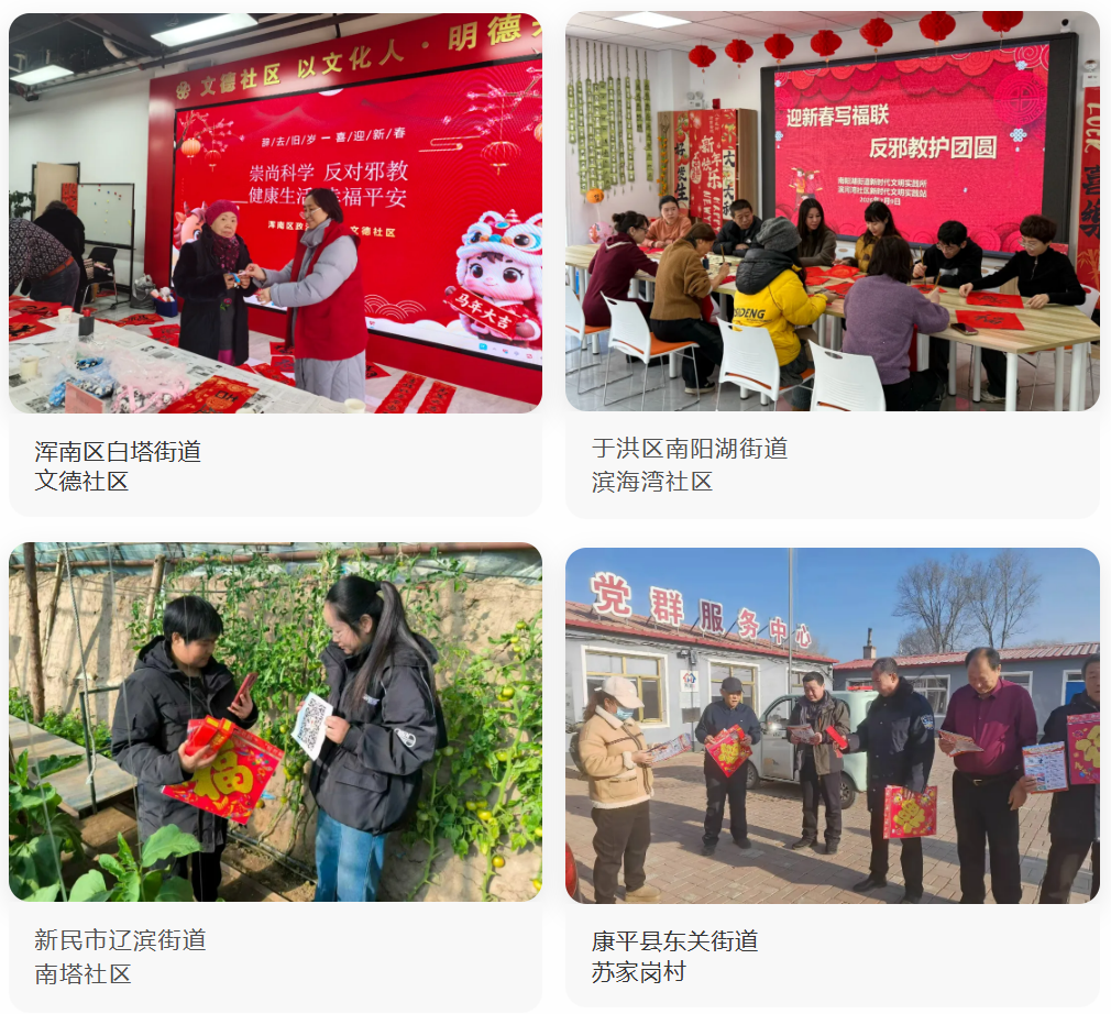 浑南区、新民市、康平县分别走进街道(乡镇)、社区(村),深入小区和群众家中,送对联送福字,讲解邪教的特征、危害以及遇到邪教怎么办等相关常识,将反邪教警示宣传教育引向基层末梢。