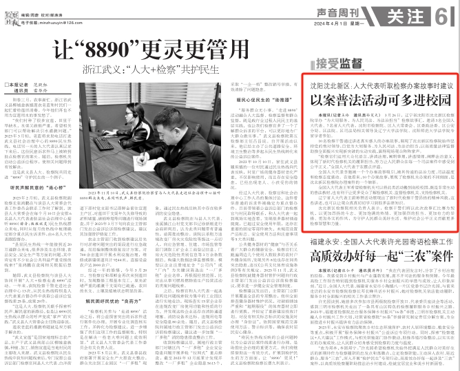 近日,《检察日报》06版刊登“沈阳沈北新区:人大代表听取检察办案故事时建议 以案普法活动可多进校园”一文,内容如下:
