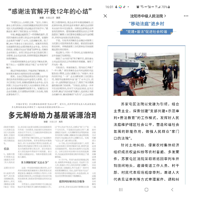 林盛法庭法官在工作中,主动了解案件当事人的真正需求,有为解决当事人诉讼成本开展的“微信群调解”,有诉讼外为当事人联系第三方托管机构申领职业年金的“解除12年心结”,有联合司法所、村组织多方调解解决的“发不出去的补偿金”……林盛法庭深入群众开展司法服务的工作经验被《辽宁法治报》、《辽宁政法》头条号、沈阳中院公众号等省市媒体进行多次报道。