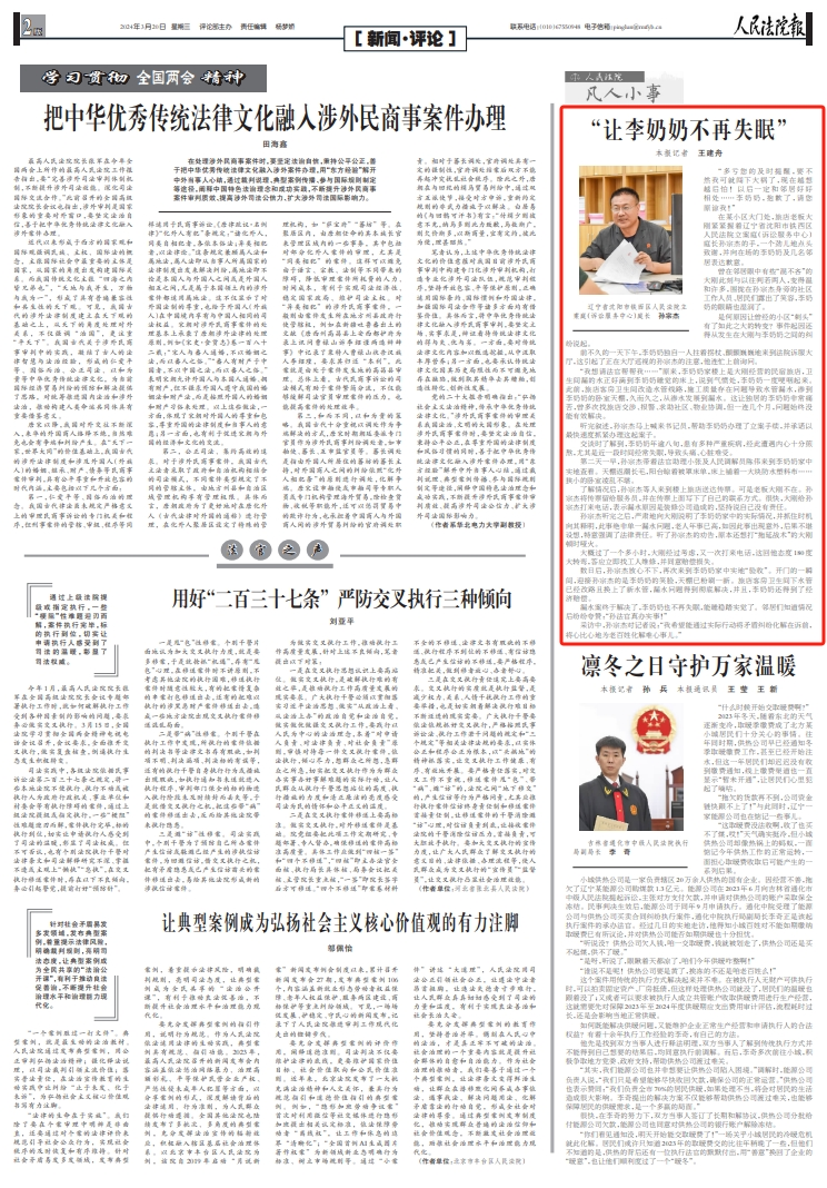 3月20日,《人民法院报》第2版“人民法院凡人小事”栏目、最高人民法院微信公众号#人民法院凡人小事#,同步报道了沈阳市铁西区人民法院立案庭(诉讼服务中心)庭长孙宗杰坚持和发展新时代“枫桥经验”,树立“抓前端、治未病”工作理念,用心用情靠前调解,将矛盾纠纷解决在基层,以小案件守护“大民生”,为群众提供诉讼服务“最优解”。