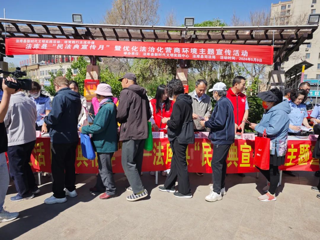 5月9日上午,法库县司法局在金沙河广场组织开展“民法典宣传月”暨优化法治化营商环境主题宣传活动。县委宣传部、县营商局、县妇联、团县委等有关部门参加活动。