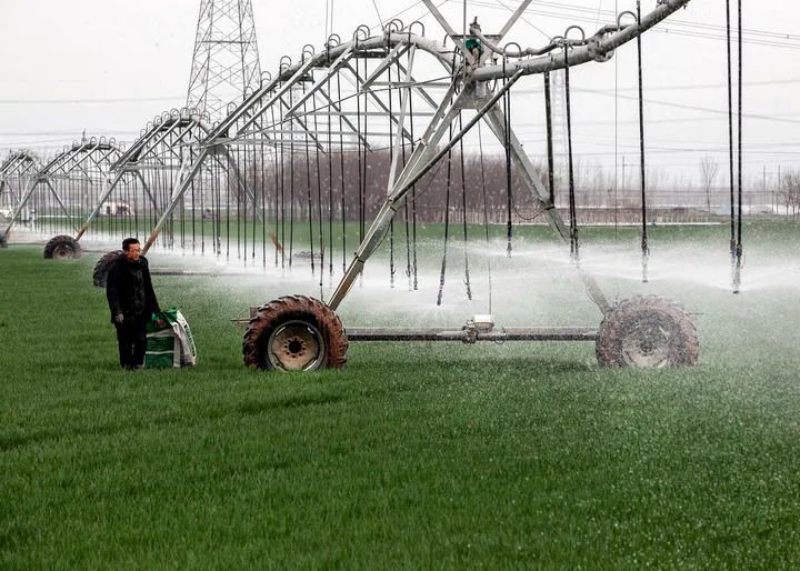 2013年7月,农历大暑时节,习近平总书记来到湖北武汉农村综合产权交易所,同工作人员和前来办理产权流转交易鉴证手续的农民交谈,详细询问产权交易具体流程。同年12月,习近平总书记在中央农村工作会议上提出一个重大论断:“把农民土地承包经营权分为承包权和经营权,实现承包权和经营权分置并行。”从“两权分离”到“三权分置”,这是中国农村改革的又一次重大创新,以四两拨千斤之力,为在坚持农村土地集体所有、保障农民承包权益前提下,推动农村土地经营权有序流转、促进多种形式农业适度规模经营打开了崭新空间。目前,全国家庭承包耕地土地经营权流转面积大幅提升,家庭农场、农民合作社等新型农业经营主体蓬勃发展,成为推动现代农业发展的重要力量。2024年3月18日,在河南省焦作市博爱县孝敬镇东原庄村瑞辉家庭农场,村民使用全自动指针式喷灌机进行浇灌作业。新华社发(程全摄)
